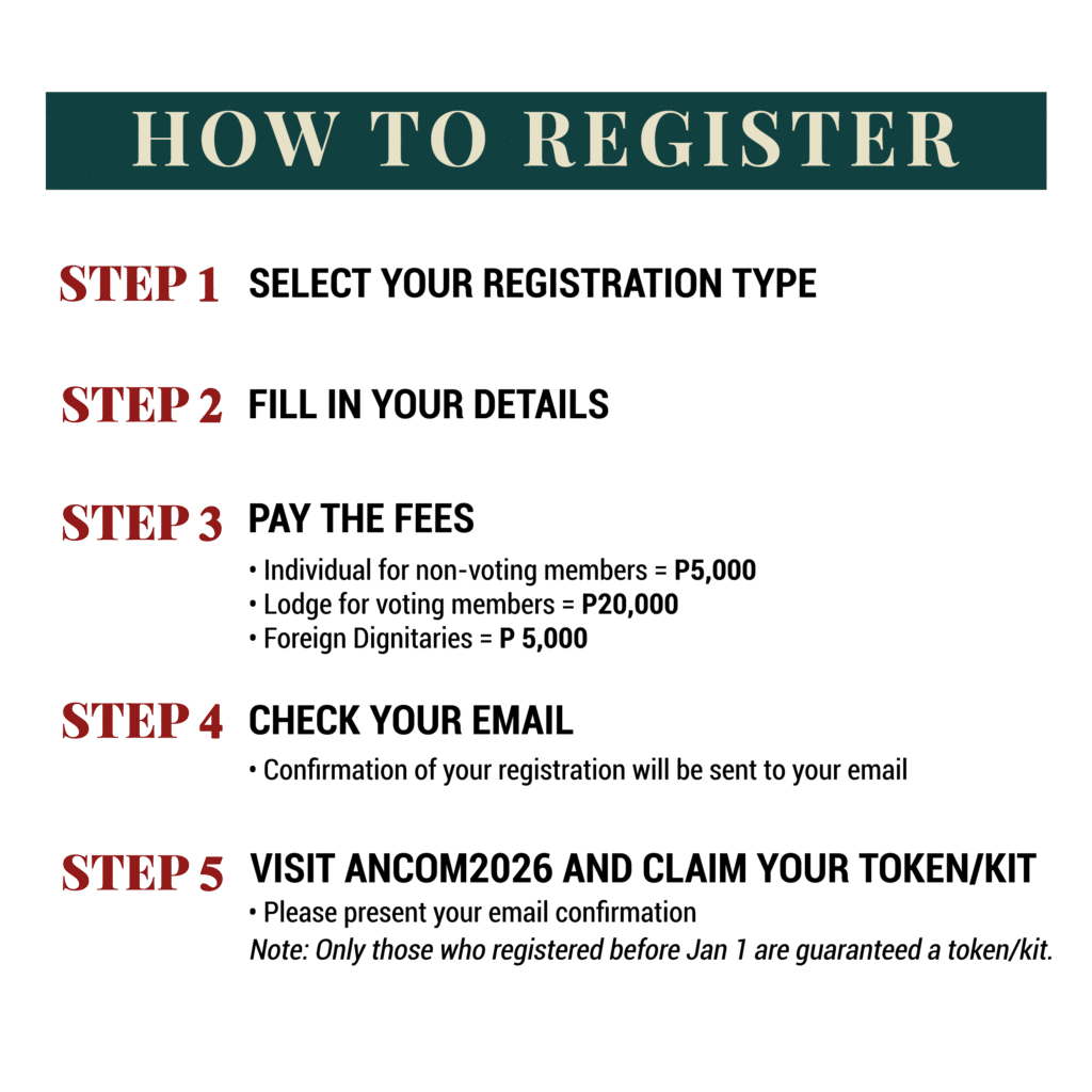 Please choose your registration type below: Individual for non-voting members, Lodge for voting members (Please settle fees in GLP), or Foreign Dignitary for members of foreign Grand Lodges with Amity relations.
